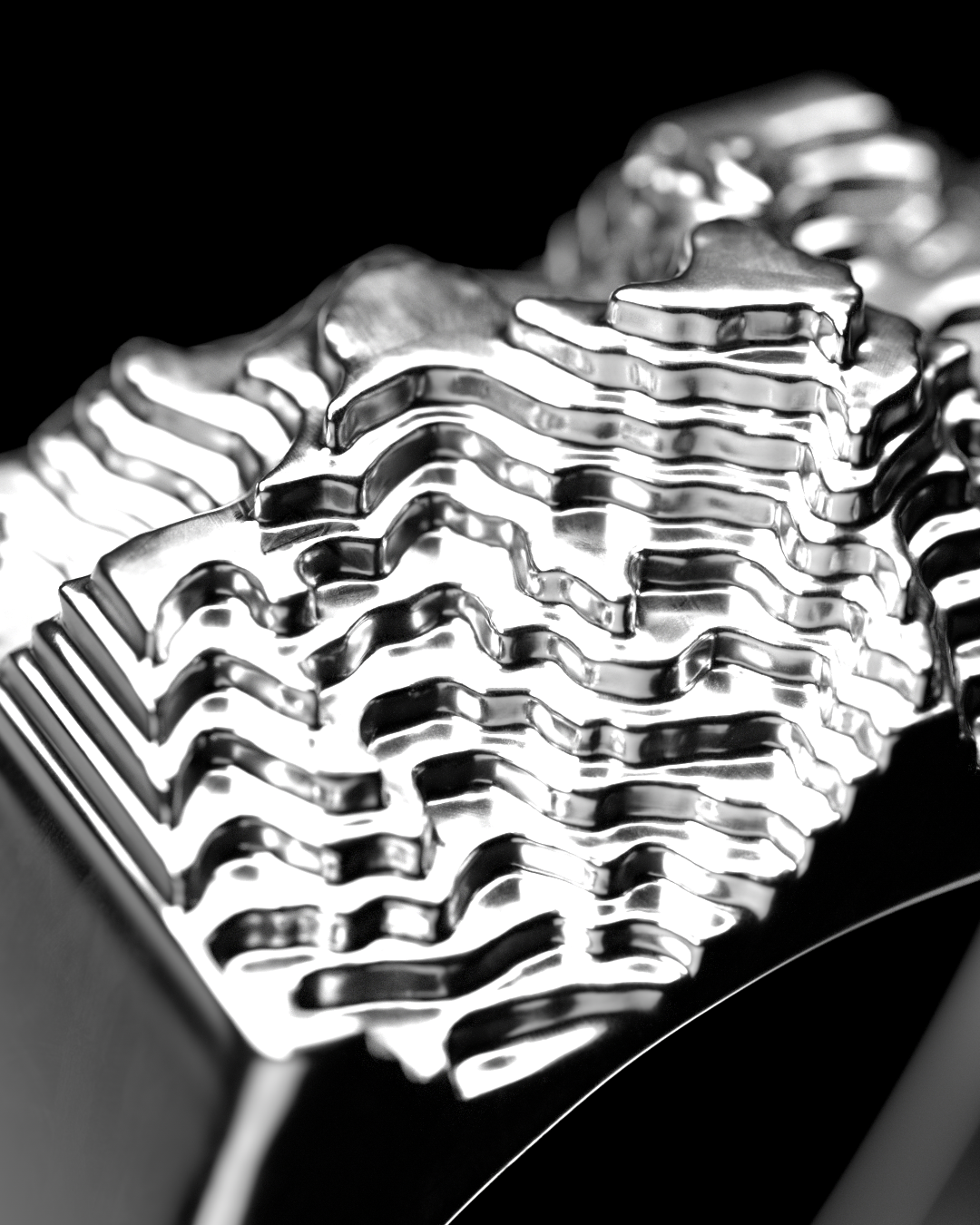 Cette bague représente le massif du Mont Blanc sous sa forme topographique stratifiée.