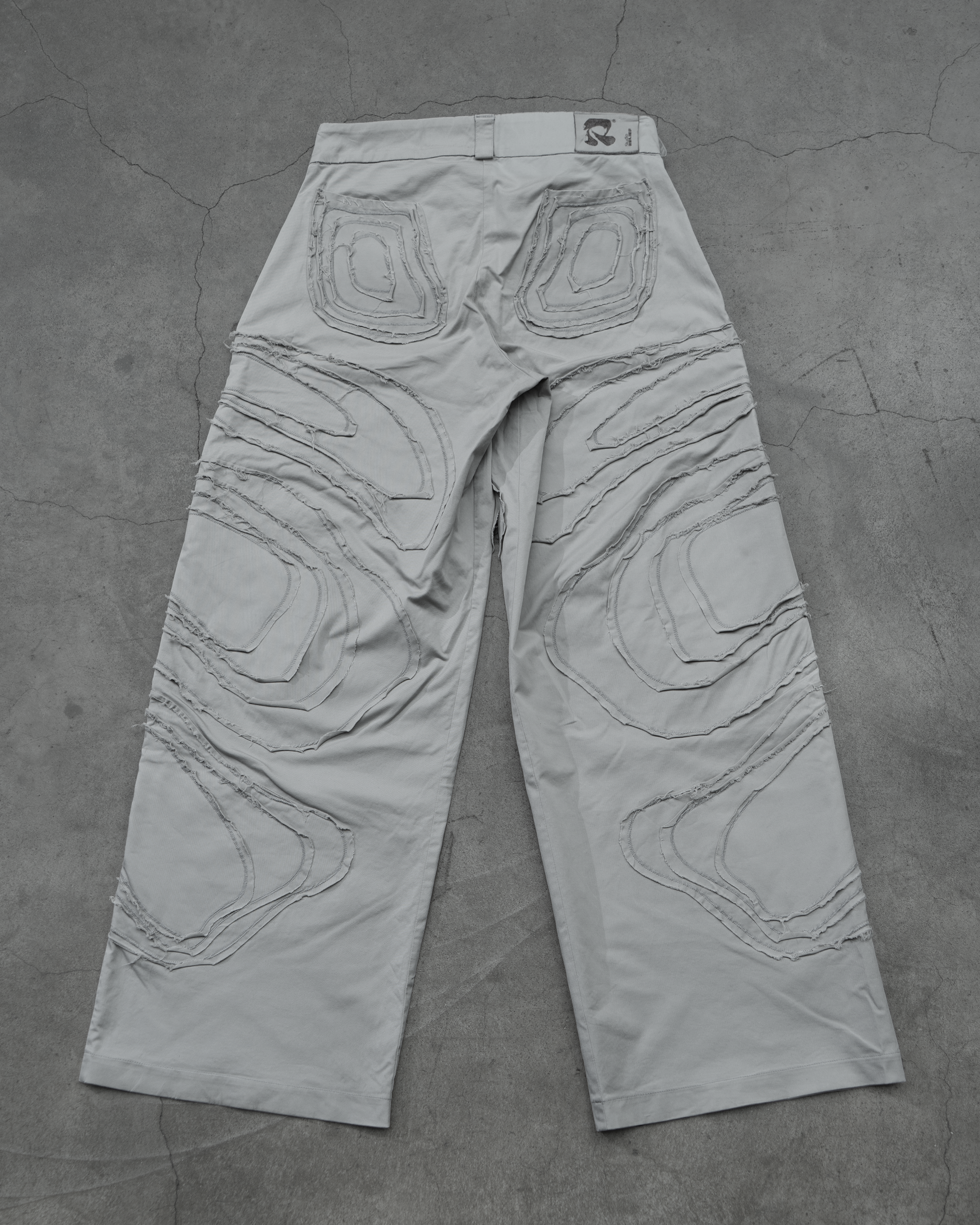 Pantalon à jambes larges. Motif topographique obtenue par empilement de matière en ton sur ton.